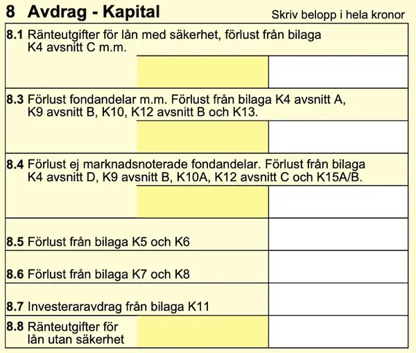 Under Avdrag - Kapital drar du också av förlust för fondandelar m m.